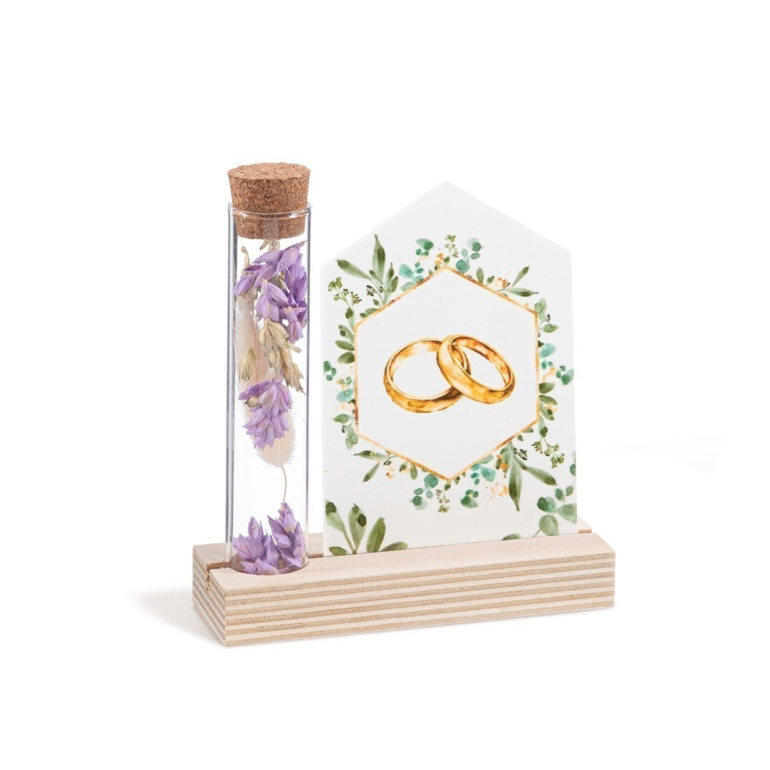 Ξύλινη βάση με print καδράκι plexiglass σε λευκό χρώμα και γυάλινο δοκιμαστικό σωλήνα.Η παράσταση απεικονίζει χρυσές βέρες μέσα σε ένα στεφανάκι από πράσινο ευκάλυπτο.