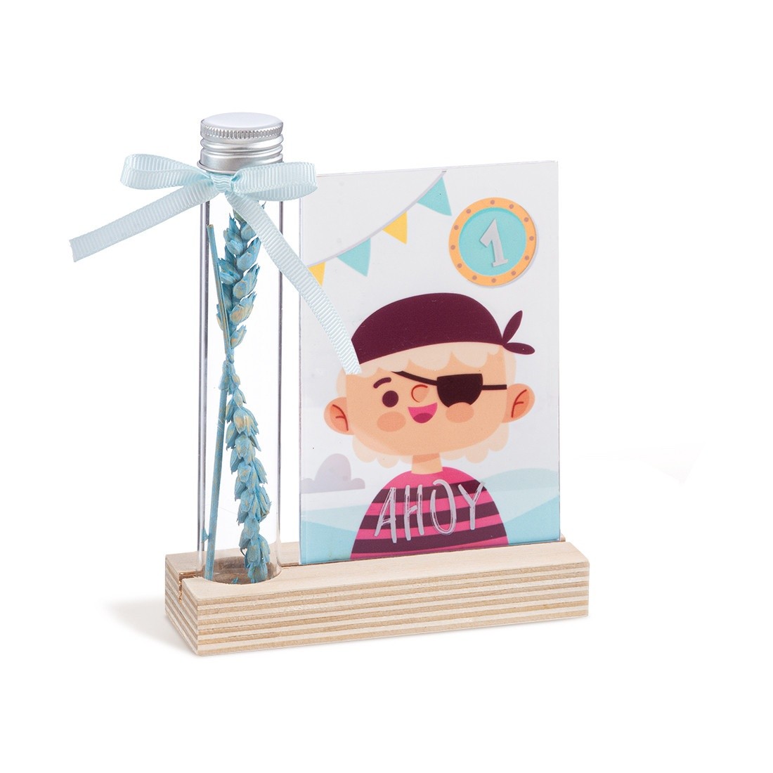 Ξύλινη βάση με print καδράκι plexiglass σε λευκό χρώμα και γυάλινο δοκιμαστικό σωλήνα.Η παράσταση απεικονίζει ένα μικρό πειρατή.