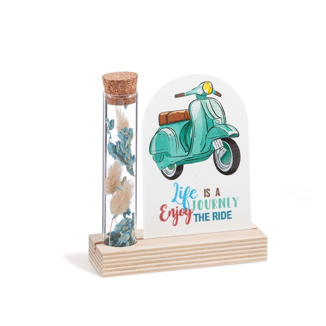 Ξύλινη βάση με print καδράκι plexiglass σε λευκό χρώμα και γυάλινο δοκιμαστικό σωλήνα.Η παράσταση απεικονίζει τη βεραμάν βέσπα και moto "Life is a journey, enjoy the ride".
