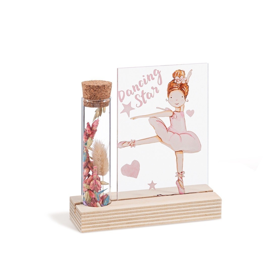 Ξύλινη βάση με print παραλληλόγραμμο καδράκι plexiglass σε λευκό χρώμα και γυάλινο δοκιμαστικό σωλήνα.Η παράσταση απεικονίζει μπαλαρίνα ως "dancing star".