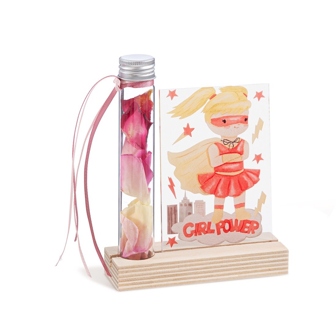 Ξύλινη βάση με print παραλληλόγραμμο καδράκι plexiglass σε λευκό χρώμα και γυάλινο δοκιμαστικό σωλήνα.Η παράσταση απεικονίζει την Super Girl power.
