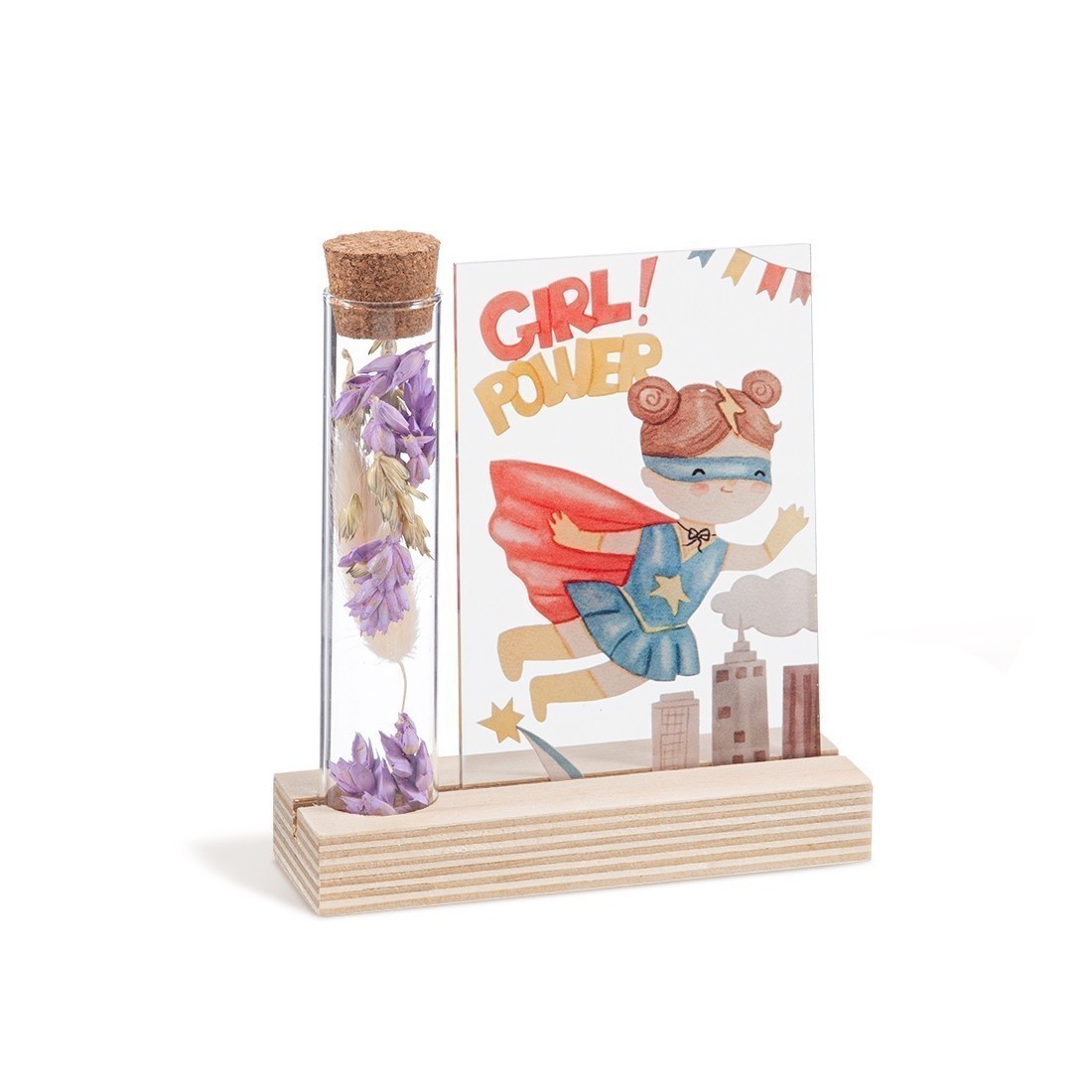Ξύλινη βάση με print παραλληλόγραμμο καδράκι plexiglass σε λευκό χρώμα και γυάλινο δοκιμαστικό σωλήνα.Η παράσταση απεικονίζει την Super Girl power.
