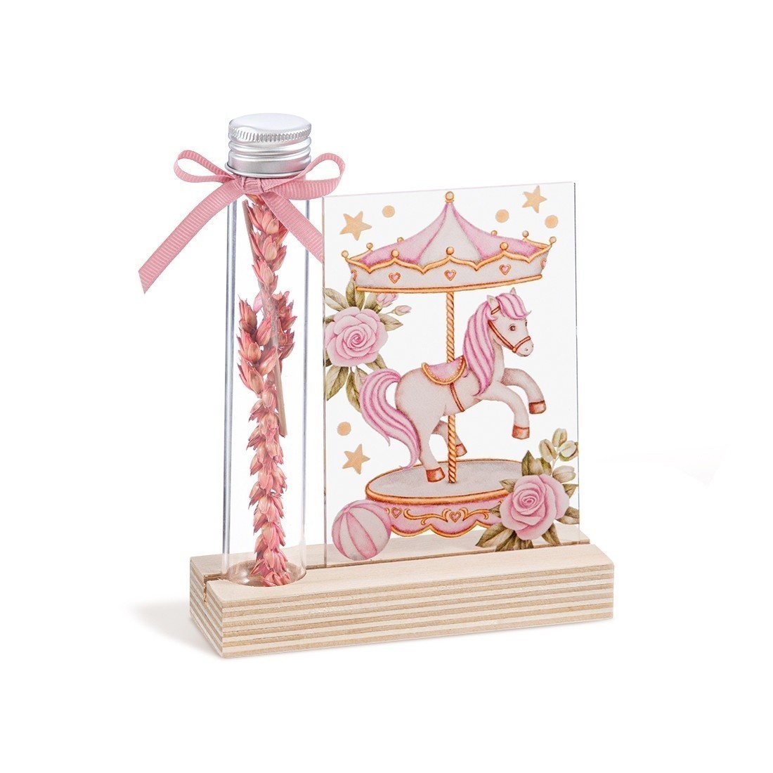 Ξύλινη βάση με print παραλληλόγραμμο καδράκι plexiglass σε λευκό χρώμα και γυάλινο δοκιμαστικό σωλήνα.Η παράσταση απεικονίζει ένα ροζ καρουζέλ.
