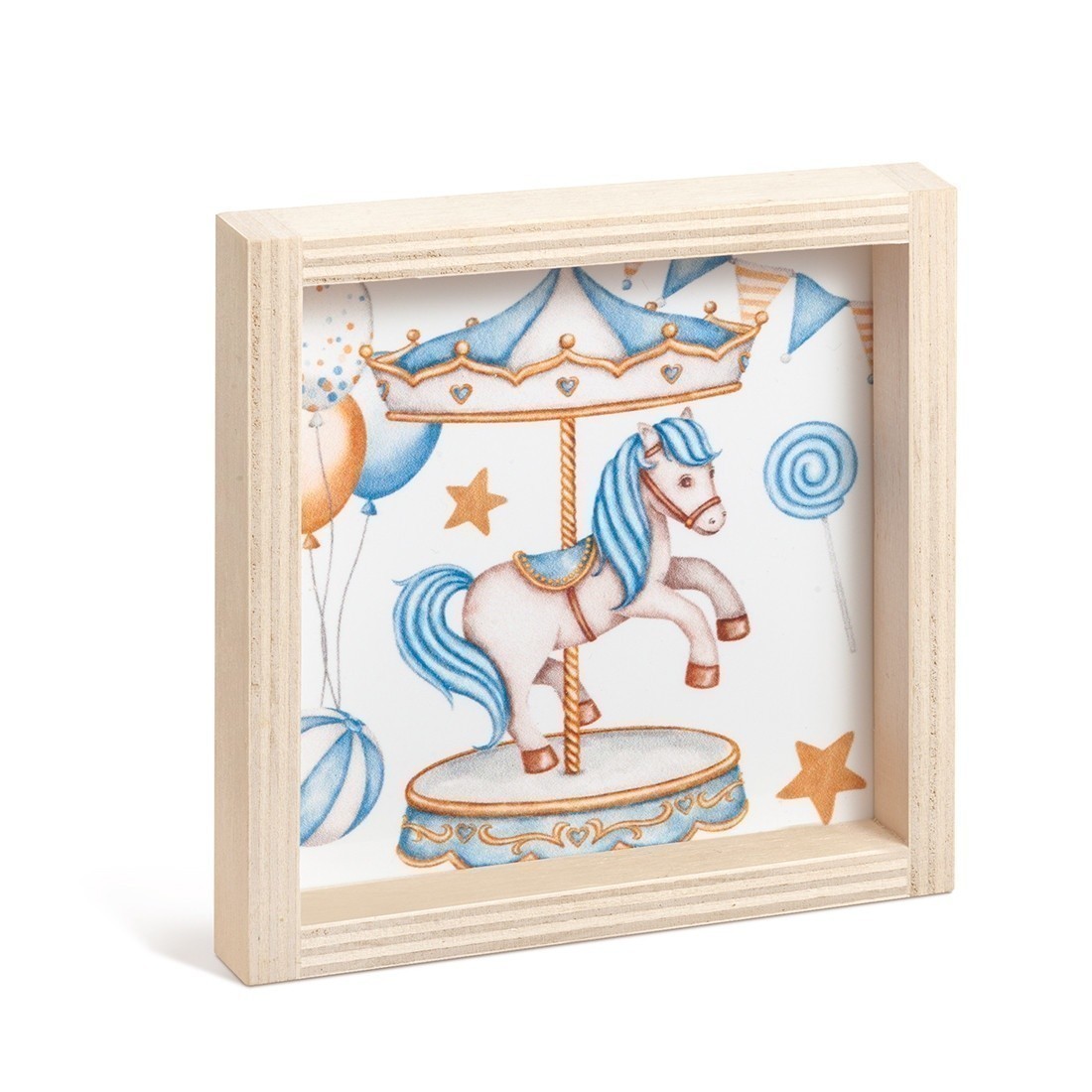 Ξύλινο καδράκι με print plexiglass παράσταση.Η παράσταση απεικονίζει σε λευκό χρώμα το σιέλ καρουζέλ.