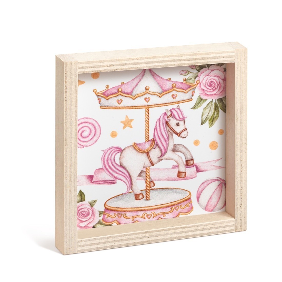 Ξύλινο καδράκι με print plexiglass παράσταση.Η παράσταση απεικονίζει σε λευκό χρώμα ένα ροζ καρουζέλ.