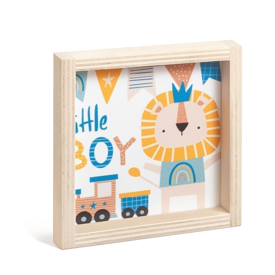 Ξύλινο καδράκι με print plexiglass παράσταση.Η παράσταση απεικονίζει σε λευκό χρώμα ένα λιονταράκι σε σιέλ αποχρώσεις.