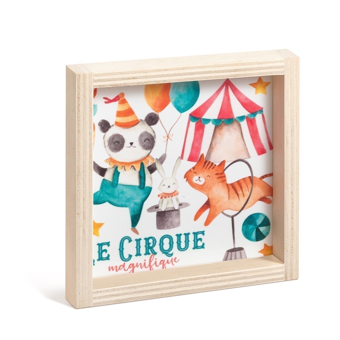 Ξύλινο καδράκι με print plexiglass παράσταση.Η παράσταση απεικονίζει σε λευκό χρώμα το panda με την γατούλα να κάνουν ακροβατικά με φόντο τη σκηνή του τσίρκου.