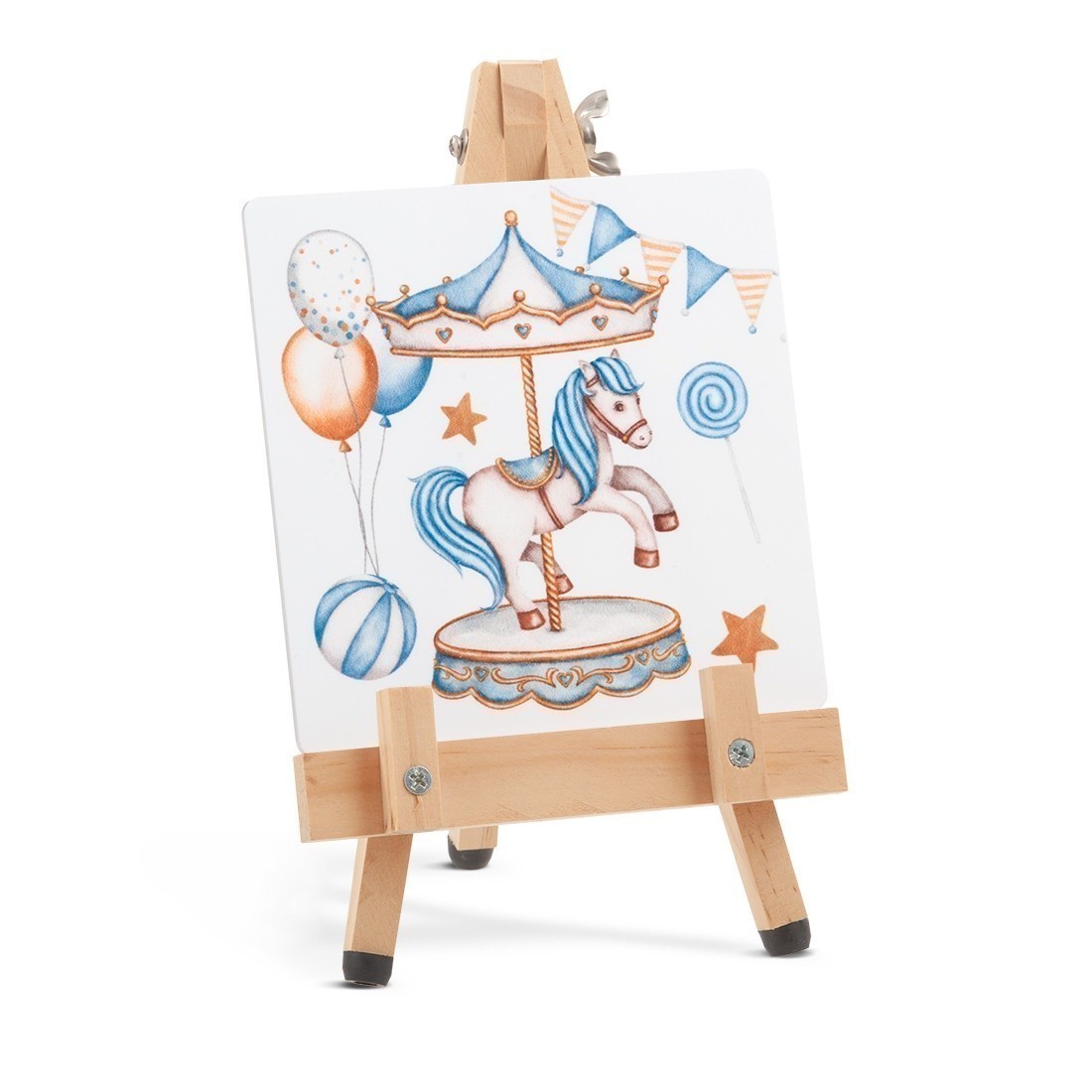 Ξύλινο καβαλέτο με print plexiglass παραλληλόγραμμο.Η παράσταση απεικονίζει σε λευκό χρώμα το σιέλ καρουζέλ.