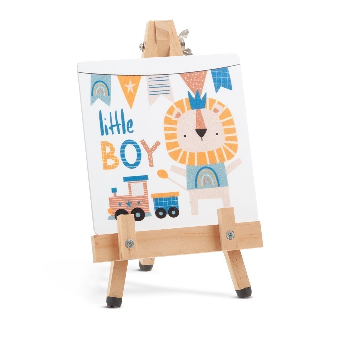 Ξύλινο καβαλέτο με print plexiglass παραλληλόγραμμο.Η παράσταση απεικονίζει σε λευκό χρώμα ένα λιονταράκι σε σιέλ αποχρώσεις .