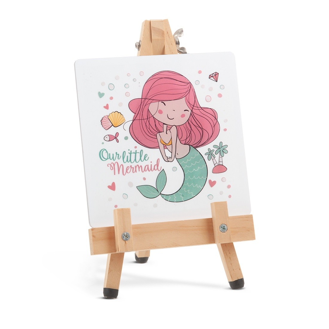 Ξύλινο καβαλέτο με print plexiglass παραλληλόγραμμο.Η παράσταση απεικονίζει σε λευκό χρώμα την γοργόνα.