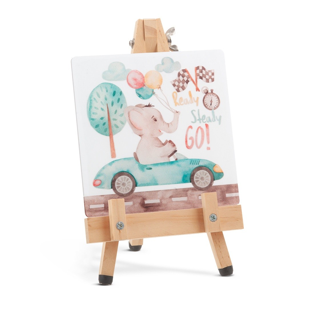 Ξύλινο καβαλέτο με print plexiglass παραλληλόγραμμο.Η παράσταση απεικονίζει σε λευκό χρώμα το ελεφαντάκι να συμμετέχει σε αγώνες φόρμουλας και σύνθημα "READY, STEADY, GO".