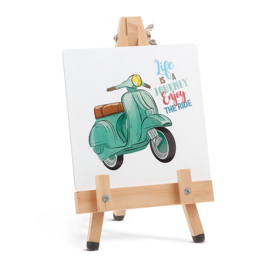 Ξύλινο καβαλέτο με print plexiglass παραλληλόγραμμο.Η παράσταση απεικονίζει σε λευκό χρώμα τη βεραμάν βέσπα και moto "Life is a journey, enjoy the ride".