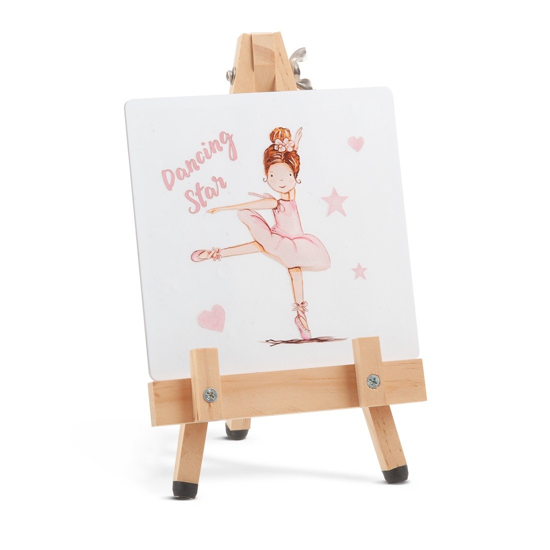 Ξύλινο καβαλέτο με print plexiglass παραλληλόγραμμο.Η παράσταση απεικονίζει σε λευκό χρώμα την μπαλαρίνα ως "dancing star".
