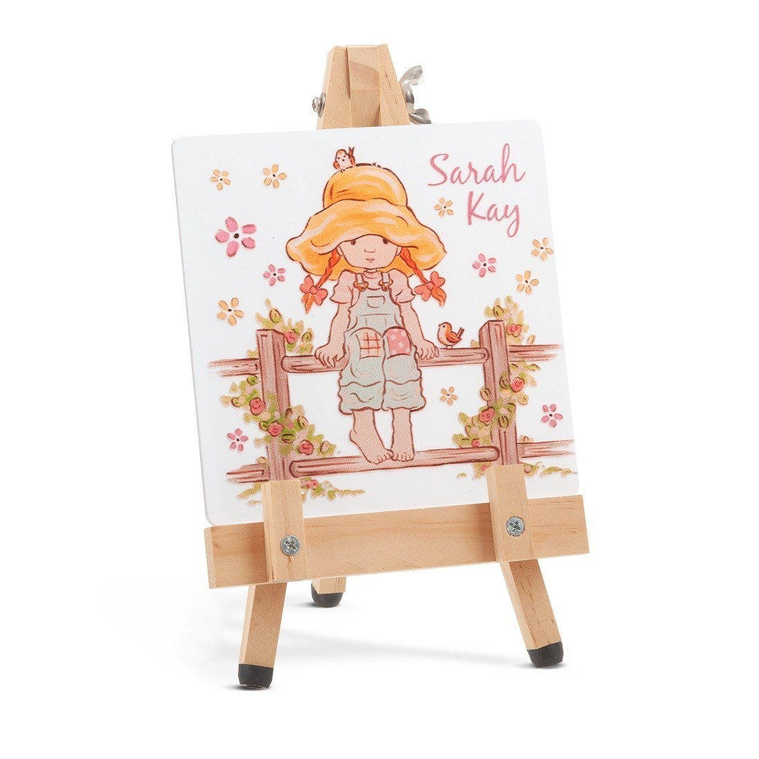 Ξύλινο καβαλέτο με print plexiglass παραλληλόγραμμο.Η παράσταση απεικονίζει σε λευκό χρώμα την Sarah Kay στο φράχτη.