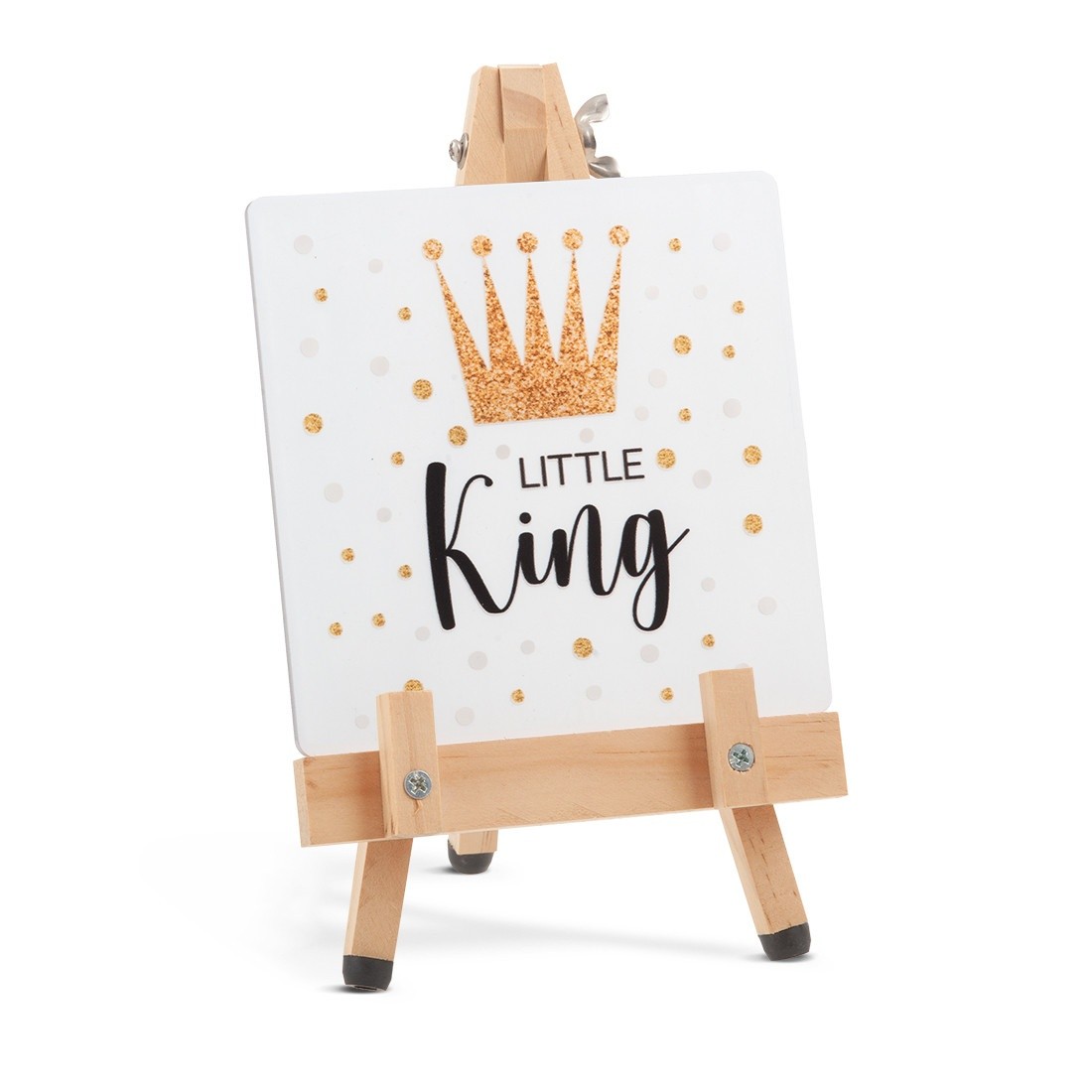Ξύλινο καβαλέτο με print plexiglass παραλληλόγραμμο.Η παράσταση απεικονίζει σε λευκό χρώμα την κορώνα του "Little King".