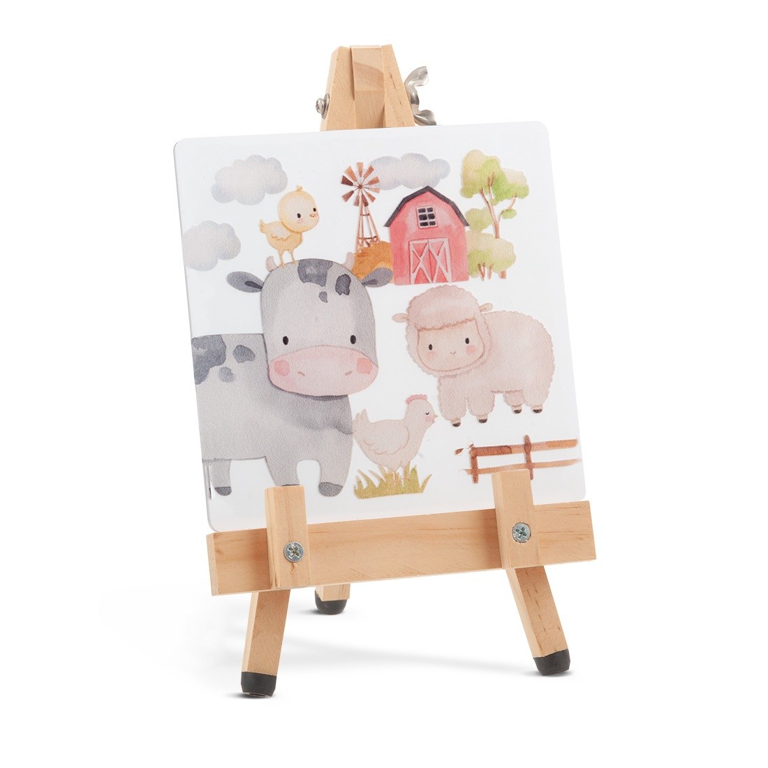 Ξύλινο καβαλέτο με print plexiglass παραλληλόγραμμο.Η παράσταση απεικονίζει σε λευκό χρώμα τα ζζωάκια της φάρμας.