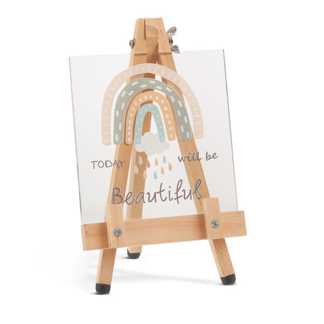 Ξύλινο καβαλέτο με print plexiglass παραλληλόγραμμο.Η παράσταση απεικονίζει σε διάφανο χρώμα το ουράνιο τόξο μετά τη βροχή και moto "Today wil be beautiful".