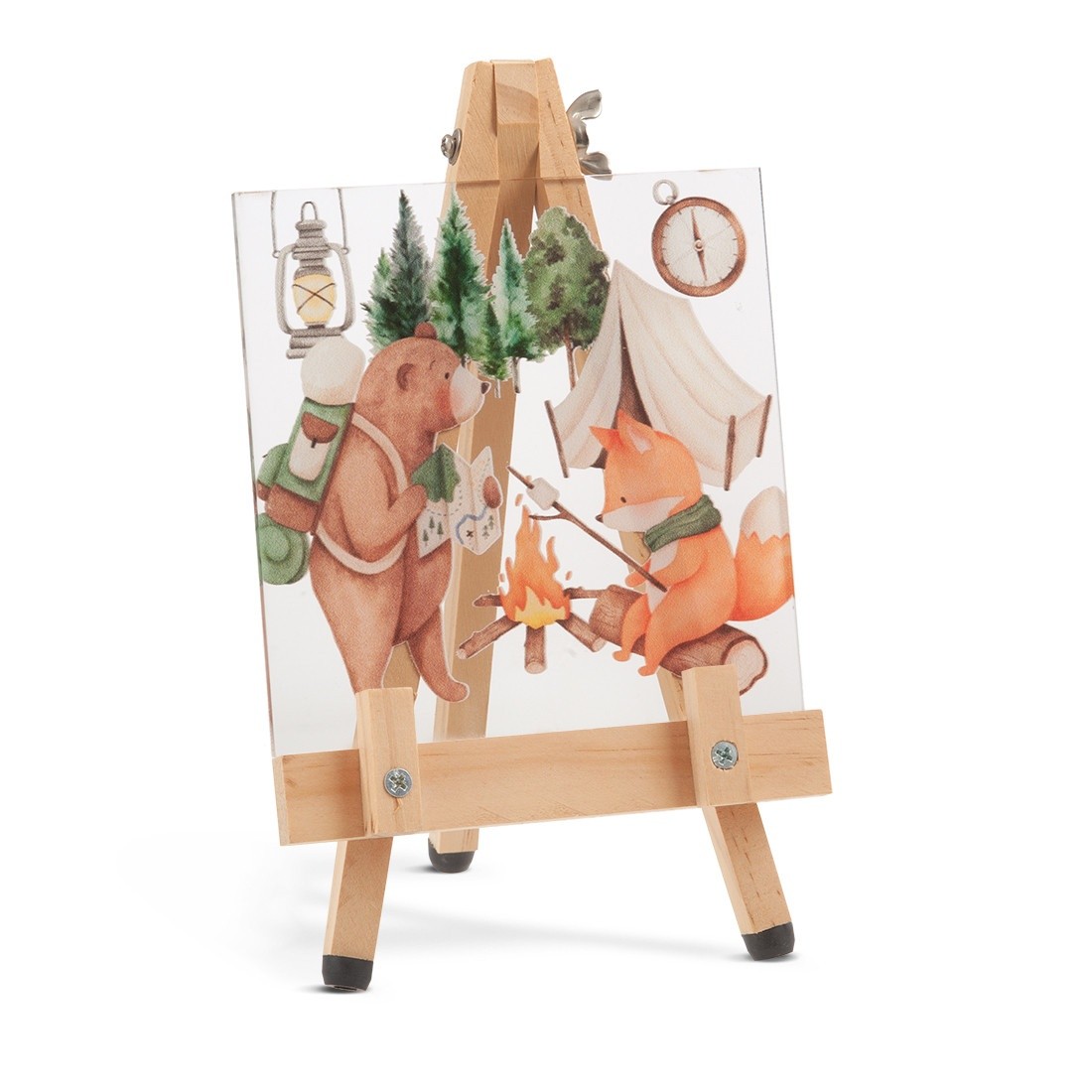 Ξύλινο καβαλέτο με print plexiglass παραλληλόγραμμο.Η παράσταση απεικονίζει σε διάφανο χρώμα την αρκούδα και την αλεπού που πηγαίνουν capming.