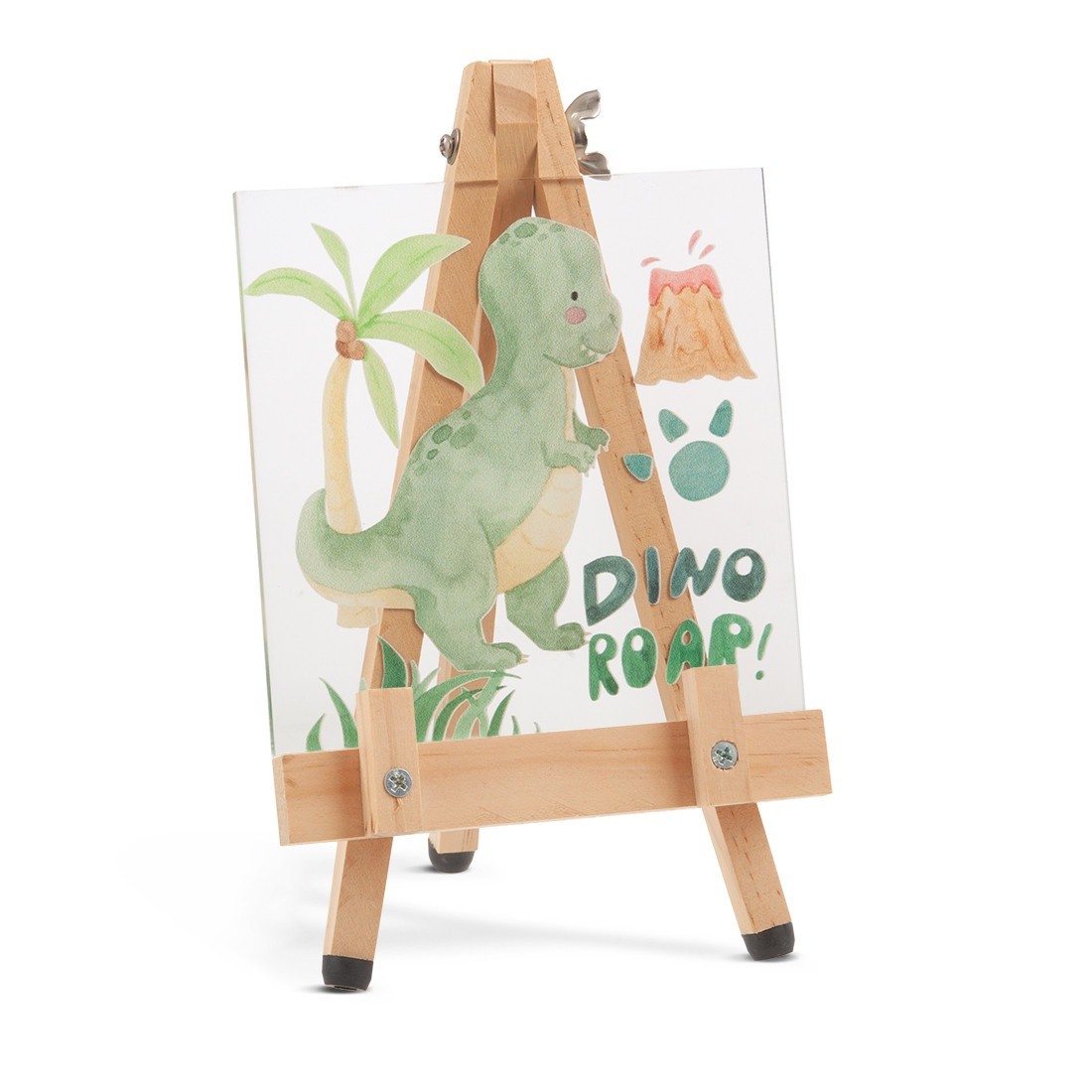 Ξύλινο καβαλέτο με print plexiglass παραλληλόγραμμο.Η παράσταση απεικονίζει σε διάφανο χρώμα ένα βεραμάν δεινόσαυρο.