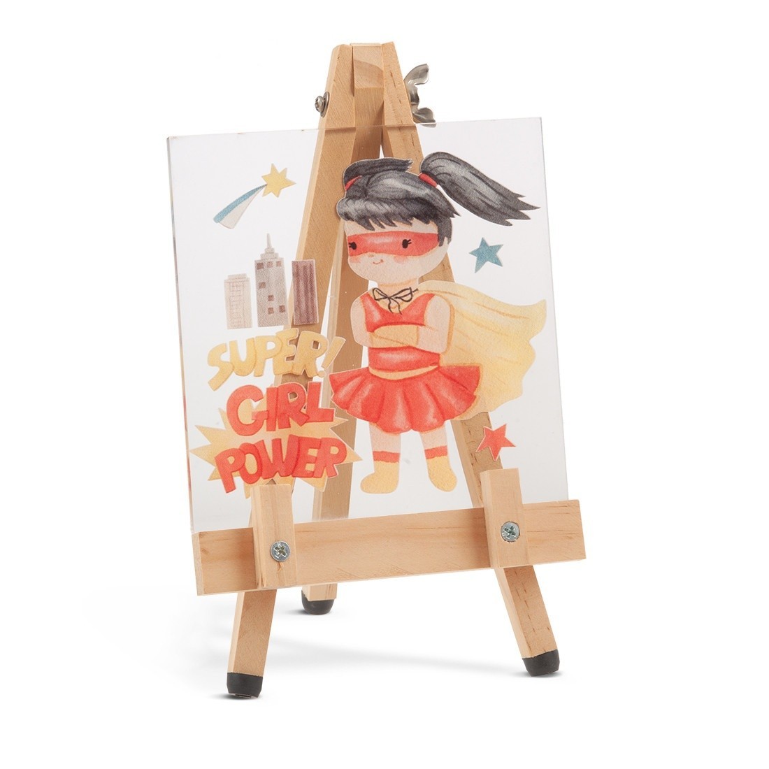 Ξύλινο καβαλέτο με print plexiglass παραλληλόγραμμο.Η παράσταση απεικονίζει σε διάφανο χρώμα την Super Girl power.