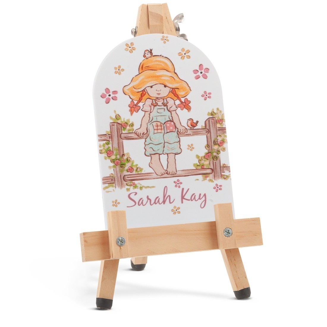 Ξύλινο καβαλέτο με print plexiglass οβάλ.Η παράσταση απεικονίζει σε λευκό χρώμα την Sarah Kay στο φράχτη.