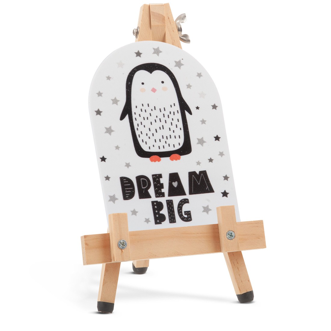 Ξύλινο καβαλέτο με print plexiglass οβάλ.Η παράσταση απεικονίζει σε λευκό χρώμα τον πιγκουίνο και moto "DREAM BIG".