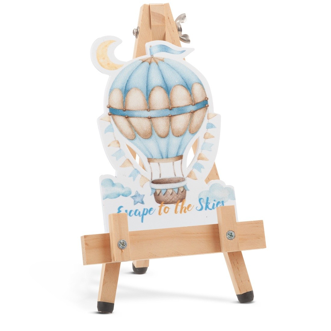 Ξύλινο καβαλέτο με print plexiglass κοπτικό.Η παράσταση απεικονίζει σε λευκό χρώμα το αερόστατο σε σιέλ αποχρώσεις δίνοντας το σύνθημα " Escape to the skies".