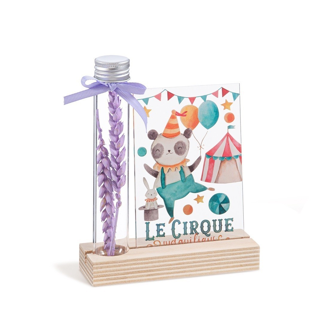 Ξύλινη βάση με print παραλληλόγραμμο καδράκι plexiglass σε λευκό χρώμα και γυάλινο δοκιμαστικό σωλήνα.Η παράσταση απεικονίζει το panda να κάνει ακροβατικά στο τσίρκο.