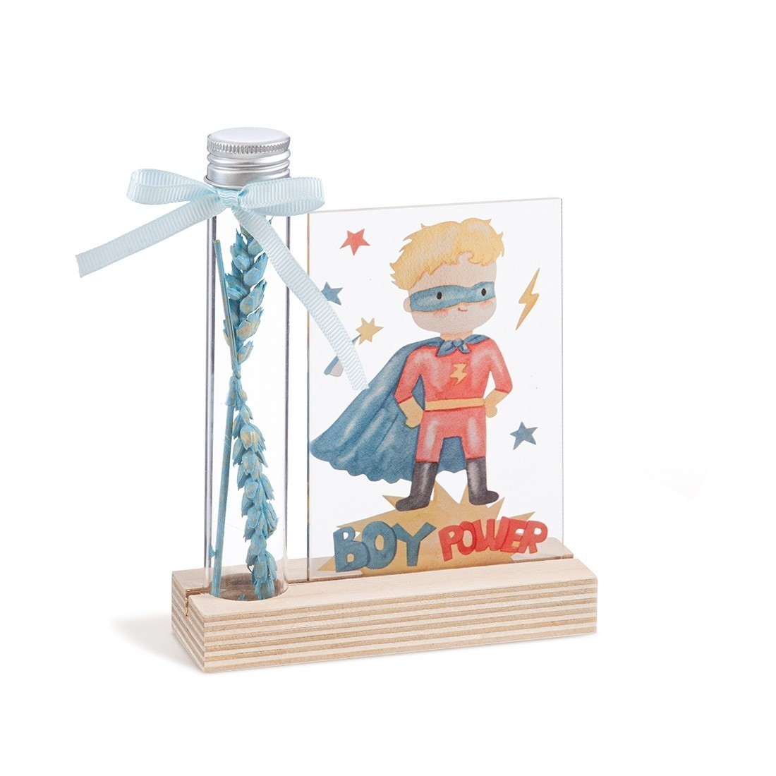 Ξύλινη βάση με print παραλληλόγραμμο καδράκι plexiglass σε λευκό χρώμα και γυάλινο δοκιμαστικό σωλήνα.Η παράσταση απεικονίζει το Super boy Power.