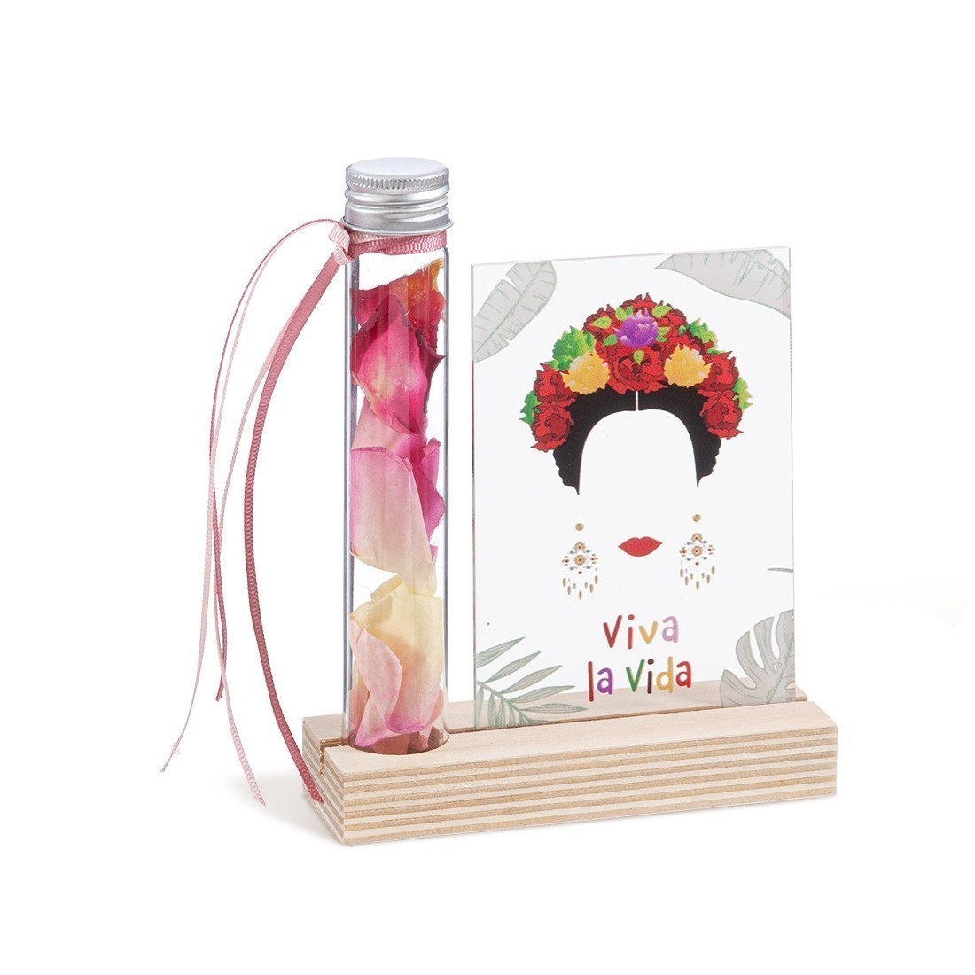 Ξύλινη βάση με print παραλληλόγραμμο καδράκι plexiglass σε λευκό χρώμα και γυάλινο δοκιμαστικό σωλήνα.Η παράσταση απεικονίζει την Frida Khalon και moto " Viva la vida".