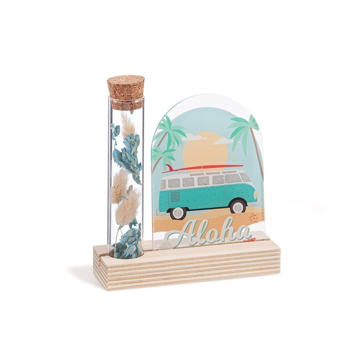 Ξύλινη βάση με print οβάλ καδράκι plexiglass σε λευκό χρώμα και γυάλινο δοκιμαστικό σωλήνα.Η παράσταση απεικονίζει ένα βεραμάν van ALOHA.