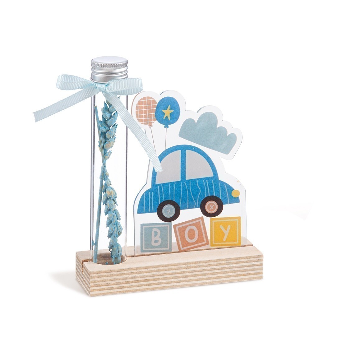 Ξύλινη βάση με print παραλληλόγραμμο καδράκι plexiglass σε λευκό χρώμα και γυάλινο δοκιμαστικό σωλήνα.Η παράσταση απεικονίζει ένα παιδικό αυτοκινητάκι σε σιέλ αποχρώσεις.