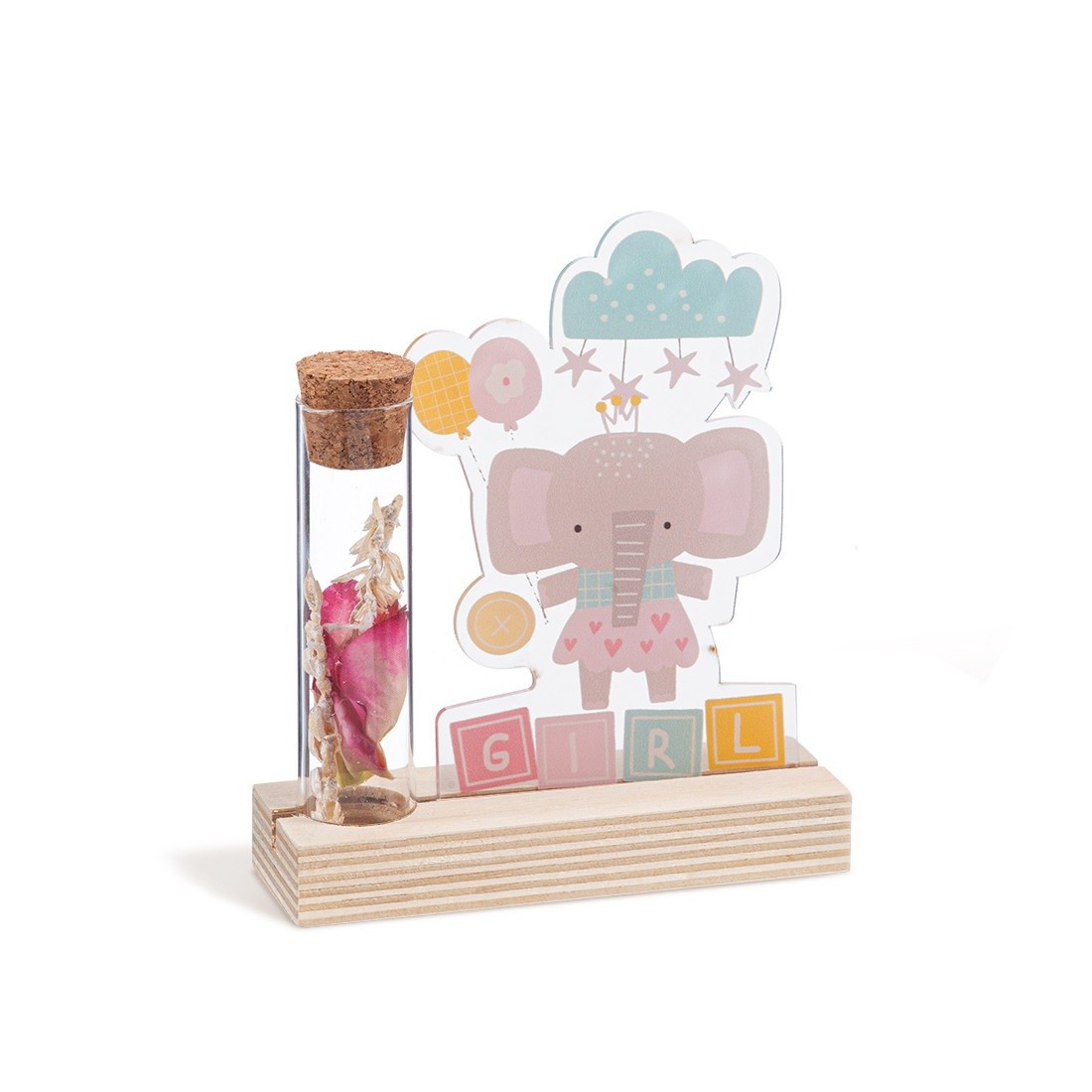 Ξύλινη βάση με print παραλληλόγραμμο καδράκι plexiglass σε λευκό χρώμα και γυάλινο δοκιμαστικό σωλήνα.Η παράσταση απεικονίζει την ελεφαντίνα σε ροζ αποχρώσεις.