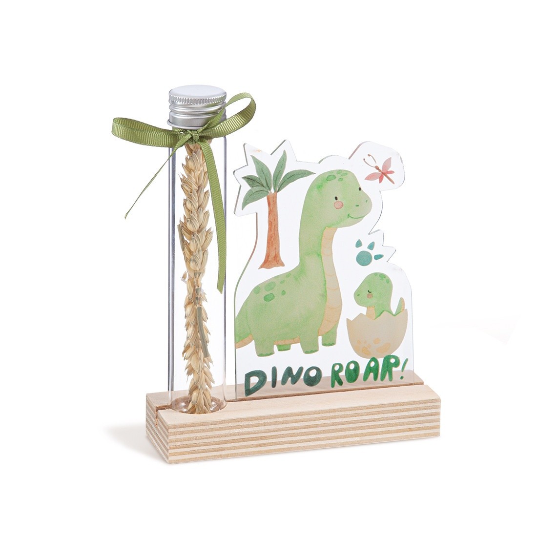 Ξύλινη βάση με print παραλληλόγραμμο καδράκι plexiglass σε λευκό χρώμα και γυάλινο δοκιμαστικό σωλήνα.Η παράσταση απεικονίζει τον Dino το δεινοσαυράκι.