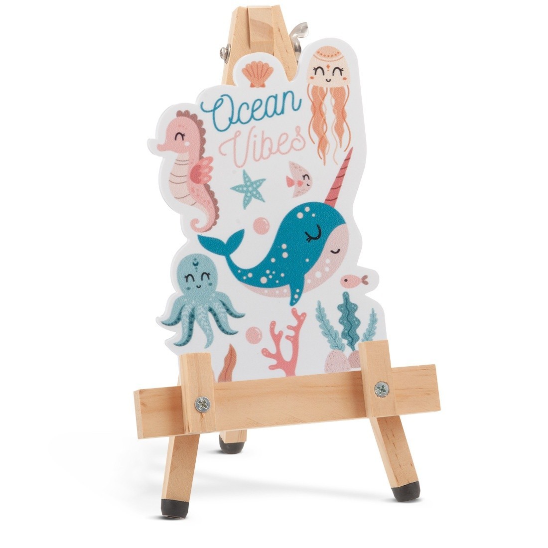 Ξύλινο καβαλέτο με print plexiglass κοπτικό.Η παράσταση απεικονίζει σε λευκό χρώμα το βυθό με τη φάλαινα, τη μέδουσα, το χταπόδι και τον ιππόκαμπο σε "Ocean Vibes".