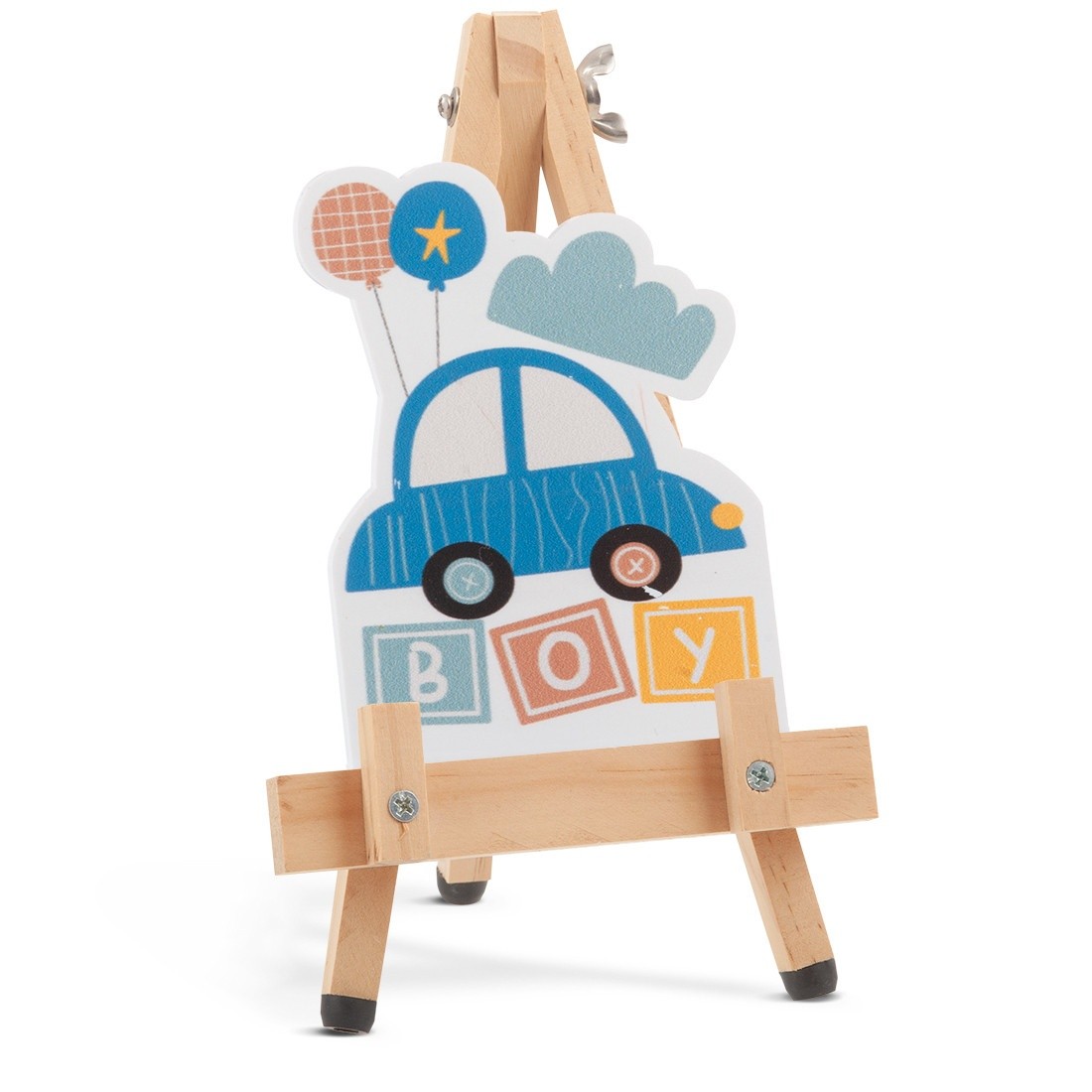 Ξύλινο καβαλέτο με print plexiglass κοπτικό.Η παράσταση απεικονίζει σε λευκό χρώμα ένα παιδικό αυτοκίνητάκι σε σιέλ αποχρώσεις.