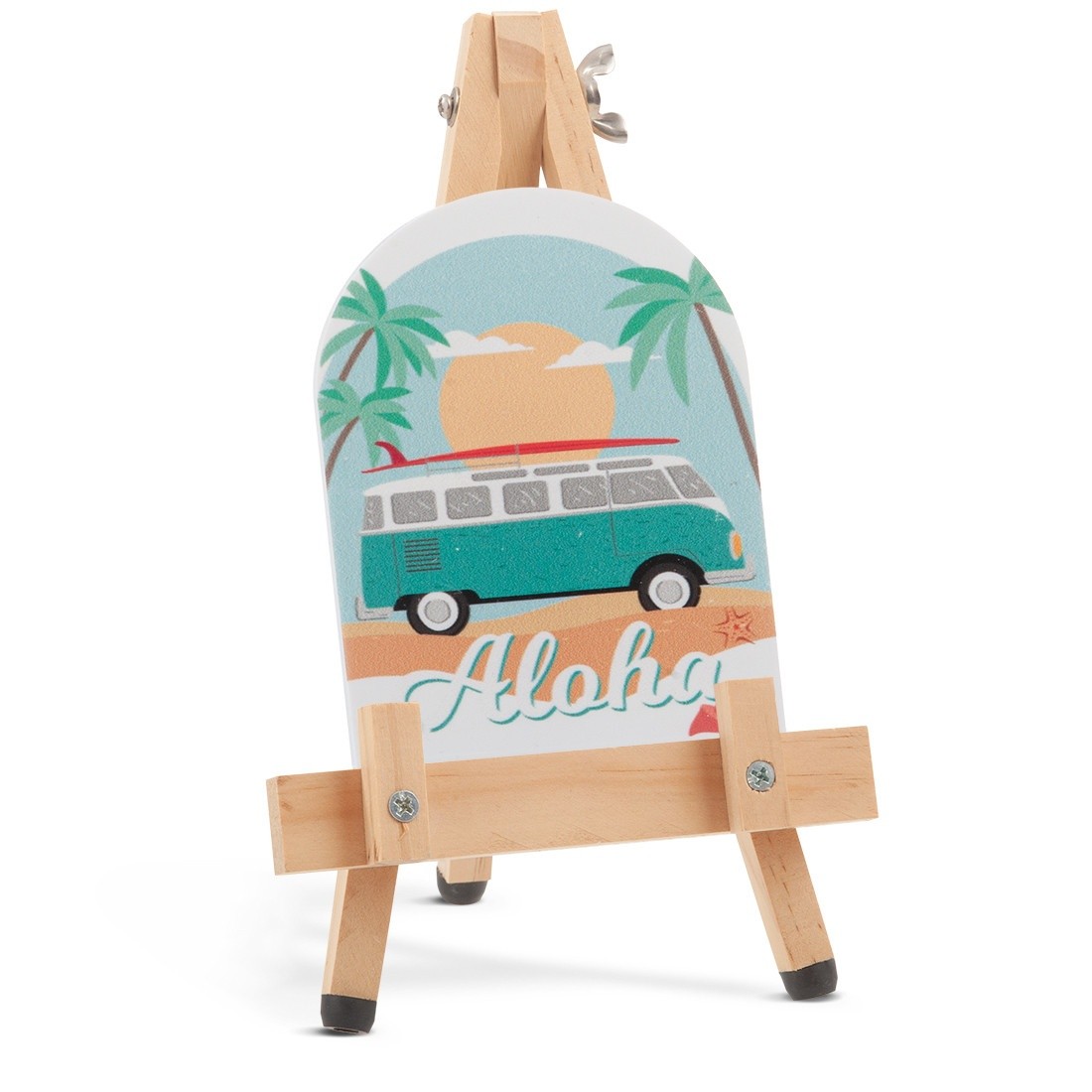 Ξύλινο καβαλέτο με print plexiglass οβάλ.Η παράσταση απεικονίζει σε λευκό χρώμα ένα βεραμάν van ALOHA.