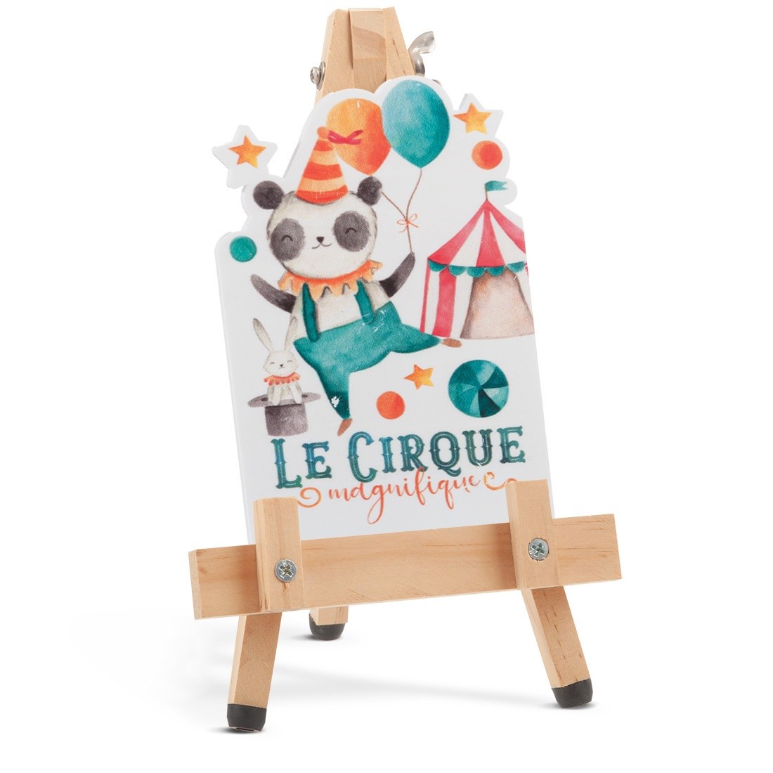 Ξύλινο καβαλέτο με print plexiglass κοπτικό.Η παράσταση απεικονίζει σε λευκό χρώμα το panda να κάνει ακροβατικά με φόντο τη σκηνή του τσίρκου.