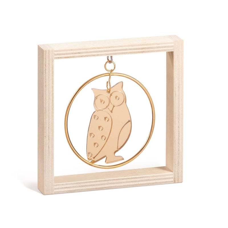 Διακοσμητικό καδράκι με σύνθεση τριών υλικών.Η σύνθεση αποτελείται από : α)κοπτικό plexiglass σε σχήμα κουκουβάγιας σε χρυσό χρώμα β) μεταλλικό στρογγυλό κρίκο σε χρυσό χρώμα γ)ξύλινο τετράγωνο καδράκι σε natural χρώμα.