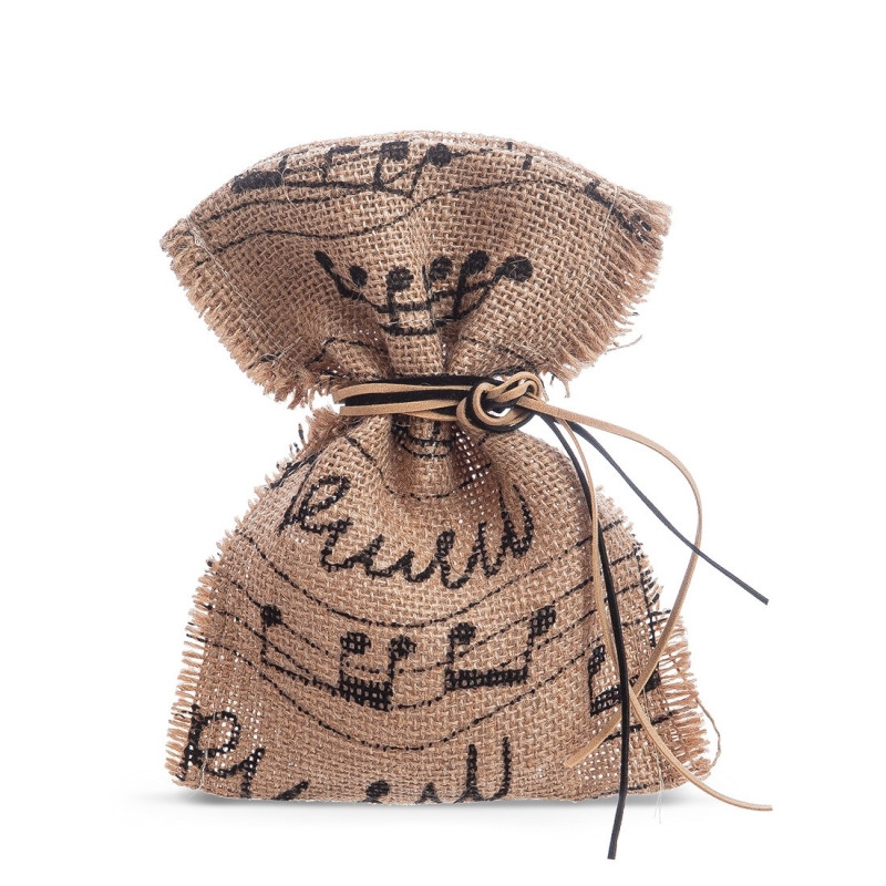 Πουγκί από λινάτσα σε φυσικό χρώμα με print μουσικό μοτίβο και ξέφτια στα τελειώματα.