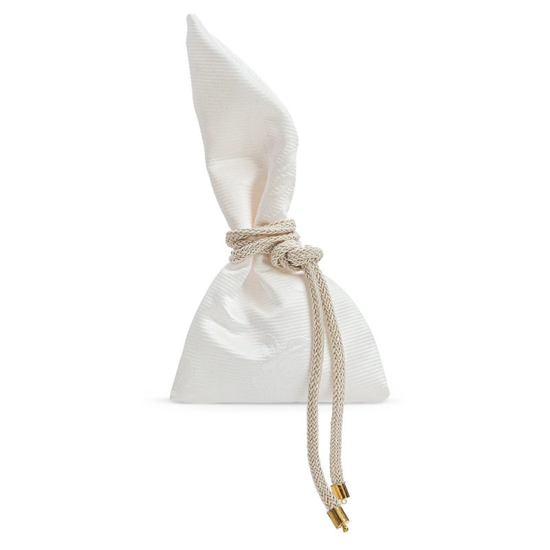 Πουγκί με λοξό γάζωμα στο λαιμό και ανάγλυφο μπροκάρ μοτίβο λουλουδιών σε εκρού χρώμα.