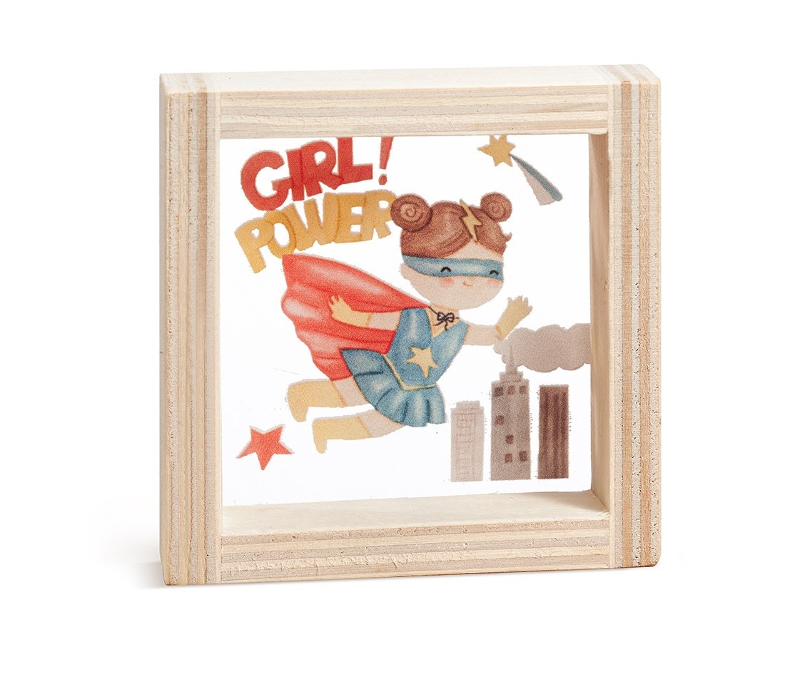 Ξύλινο καδράκι με print plexiglass παράσταση.Η παράσταση απεικονίζει σε διάφανο χρώμα την Super Girl power.