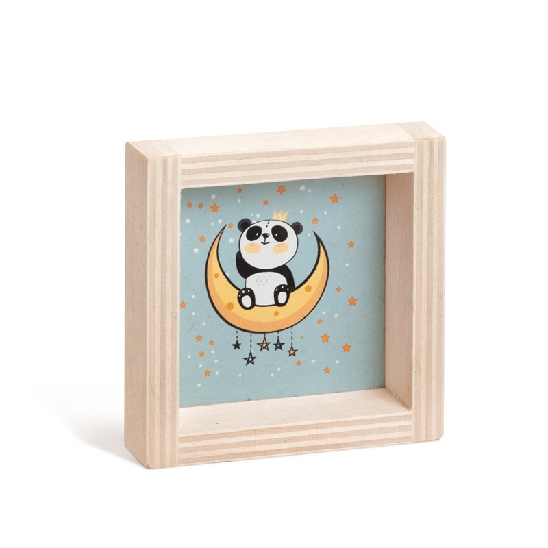 Ξύλινο διακοσμητικό καδράκι με παράσταση που απεικονίζει ένα panda πάνω στο φεγγάρι.