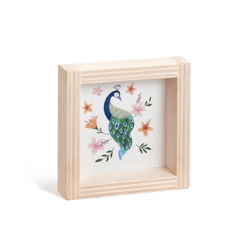 Ξύλινο διακοσμητικό καδράκι με παράσταση που απεικονίζει ένα πολύχρωμο παγώνι.