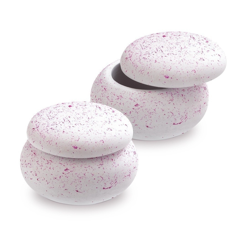 Γύψινη στρογγυλή μπιζουτιέρα.Η μπιζουτιέρα σχηματίζει την εικόνα ενός λαχταριστού macaron σε χρώμα λευκό με πιτσιλιές σε χρώμα ροζ.