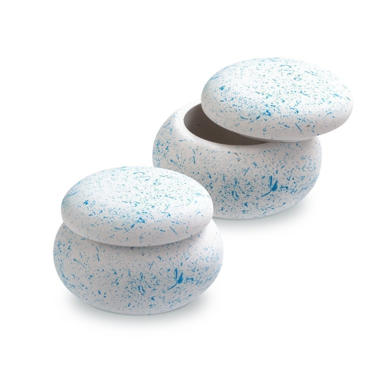 Γύψινη στρογγυλή μπιζουτιέρα.Η μπιζουτιέρα σχηματίζει την εικόνα ενός λαχταριστού macaron σε χρώμα λευκό με πιτσιλιές σε χρώμα σιελ.