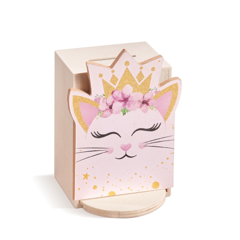 Ξύλινος κουμπαράς με κοπτικό.Η παράσταση απεικονίζει μια γατούλα.