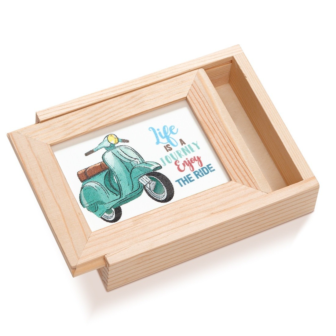 Ξύλινη κασετίνα με κορνίζα,Η κορνίζα είναι διακοσμημένη με παραλληλόγραμμο print plexiglass καδράκι σε λευκό χρώμα.Η παράσταση απεικονίζει σε οριζόντια μορφή τη βεραμάν βέσπα και moto "Life is a journey, enjoy the ride".