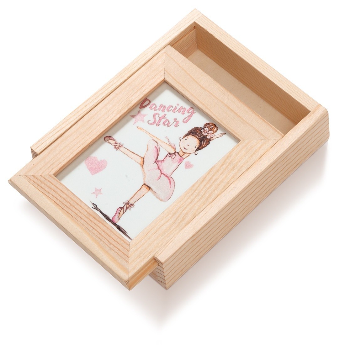 Ξύλινη κασετίνα με κορνίζα,Η κορνίζα είναι διακοσμημένη με παραλληλόγραμμο print plexiglass καδράκι σε λευκό χρώμα.Η παράσταση απεικονίζει σε κάθετη μορφή μπαλαρίνα ως "dancing star".