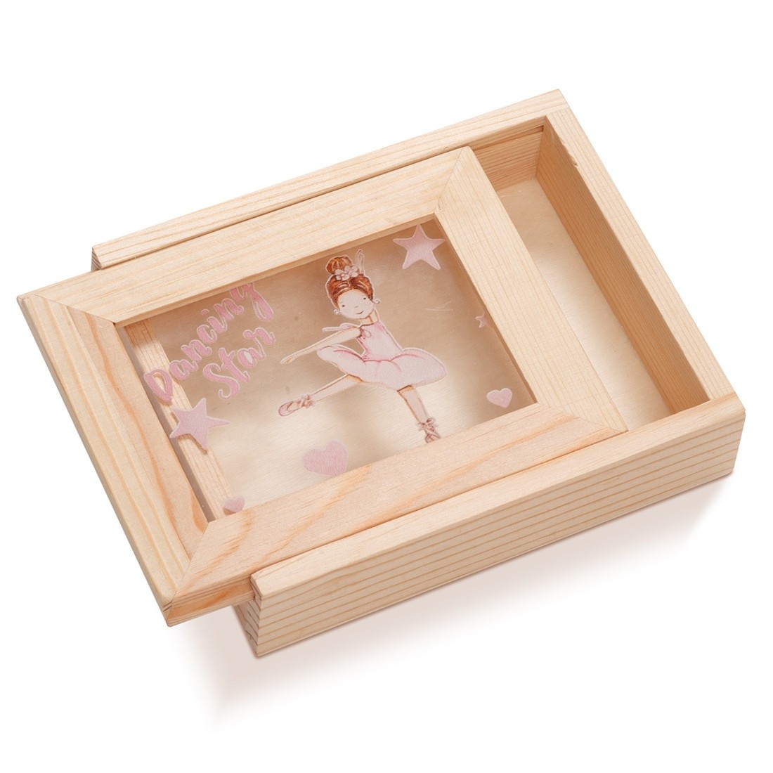 Ξύλινη κασετίνα με κορνίζα,Η κορνίζα είναι διακοσμημένη με παραλληλόγραμμο print plexiglass καδράκι σε διάφανο χρώμα.Η παράσταση απεικονίζει σε οριζόντια μορφή μπαλαρίνα ως "dancing star" .